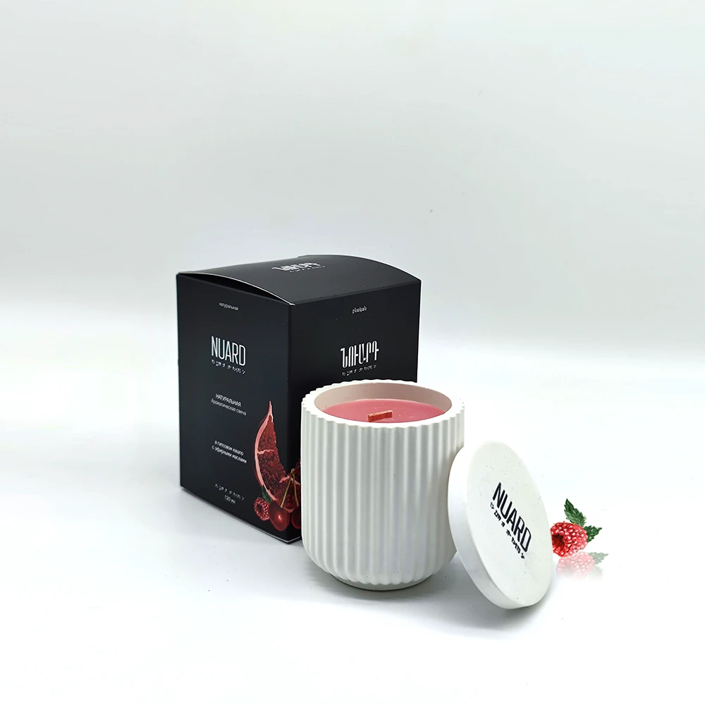NUARD's handmade candle with plaster pot and wooden wick is made from 50% soy wax, 50% mix of other waxes, fragrance and high quality essential oils. Featuring a vibrant blend of aromas, the sweet aroma of the NUARD candle will create positive energy around you and create a feeling of comfort as it spreads throughout your home. With the aroma of flowers, berries and fruits, this candle will fill the room with an enchanting scent in just 1-2 hours. The aroma of the candle spreads even when the lid is open, without lighting the candle.