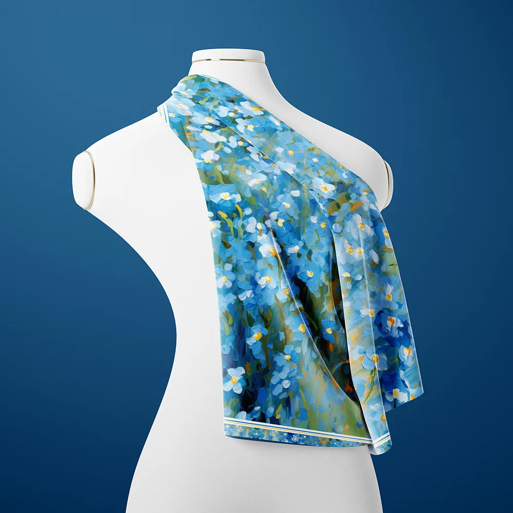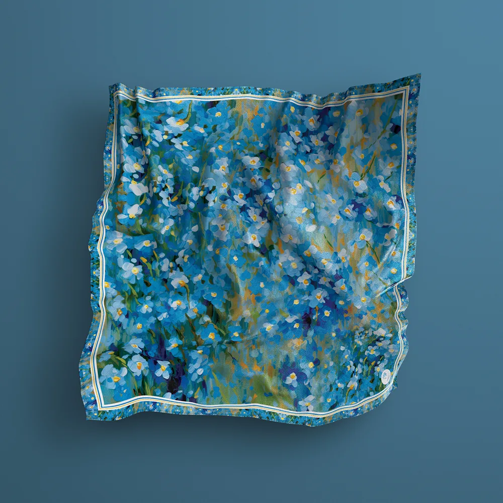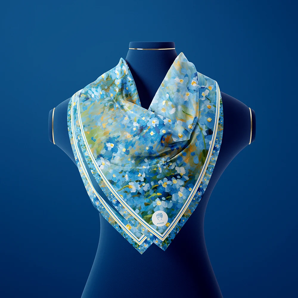 ANAHIT’s silk scarf depicts the colorful blue wildflowers of the Armenian fields. Inspired by the softness and freedom of nature, it adds a vibrant yet delicate touch to your look—enhancing your style whether paired with evening wear or everyday outfits. Especially charming with jeans, it creates a fresh and original appearance.