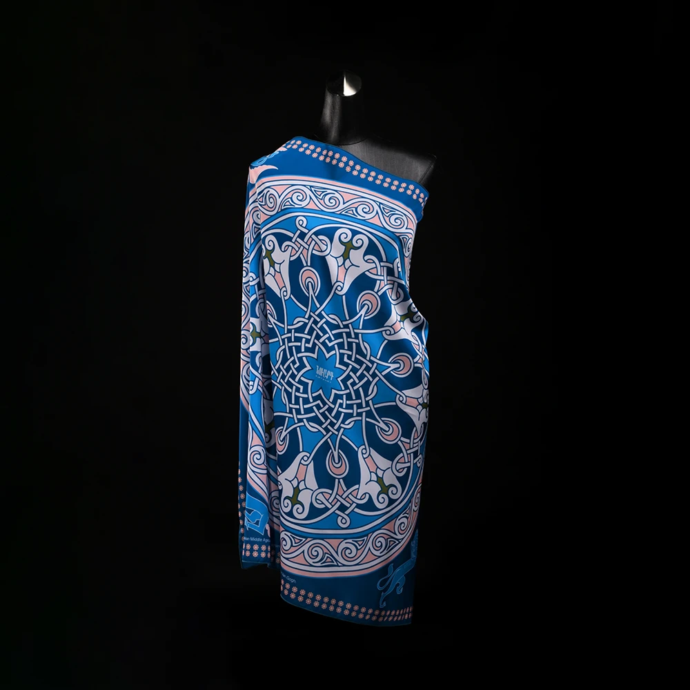 The silk scarf features Armenian medieval and Cilician ornamental patterns in the colors of Van Gogh’s "The Blossoming Almond Tree." An exclusive silk scarf with delicate hues.