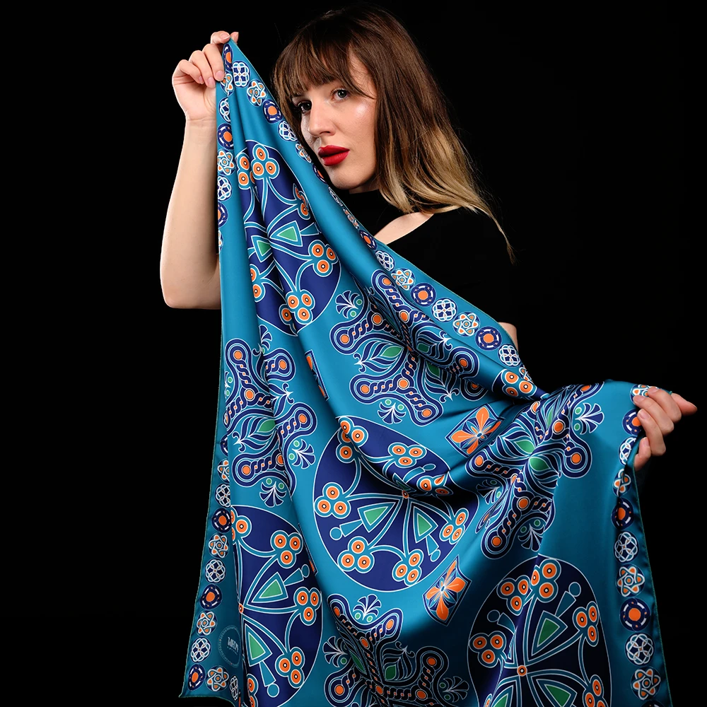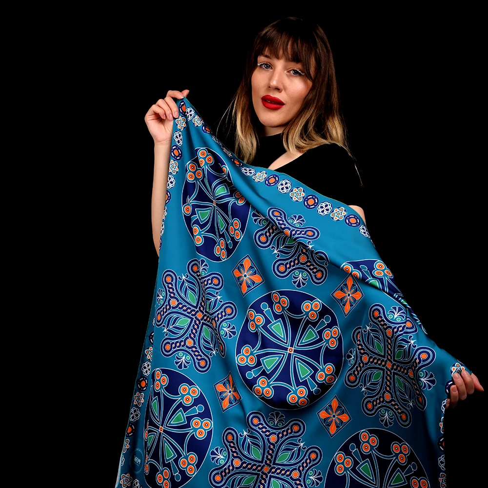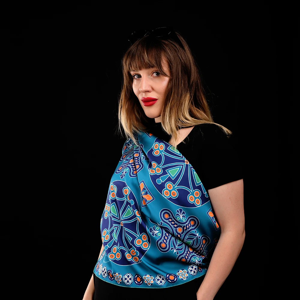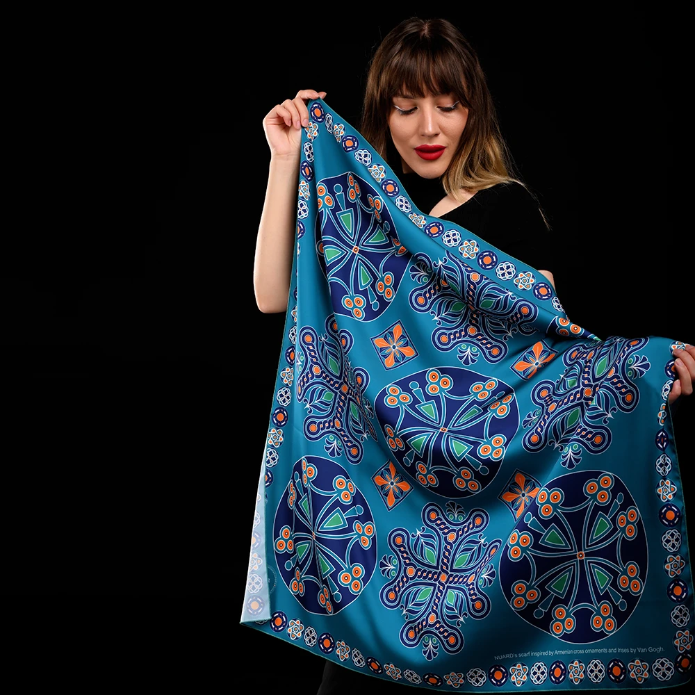 In creating this NUARD scarf, we drew inspiration from Armenian medieval cross-shaped motifs and paired them with the color palette of Van Gogh’s Irises, placing special emphasis on turquoise — the central hue symbolizing peace and purity. The turquoise tone brings a sense of freshness and depth, making the scarf a truly luxurious and distinctive accessory. This exclusive silk scarf bursts with rich, vibrant colors that are simply impossible to look away from.