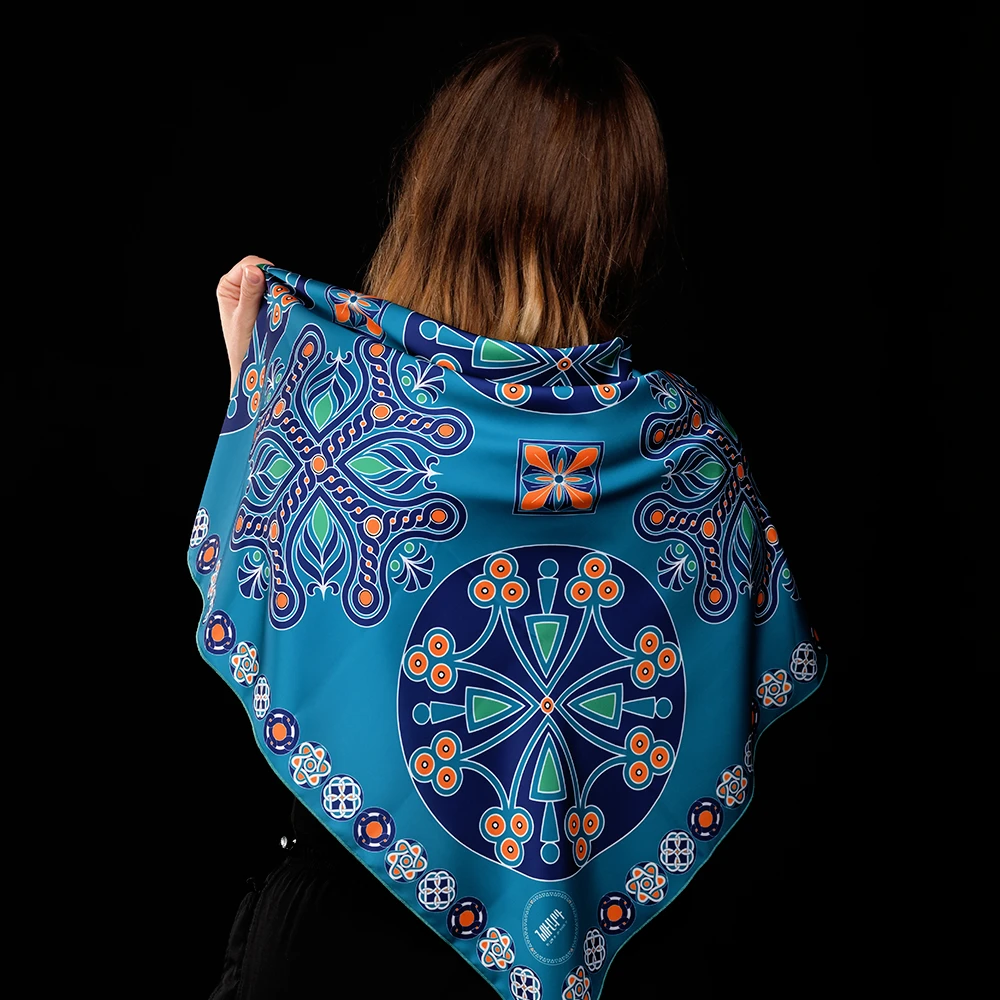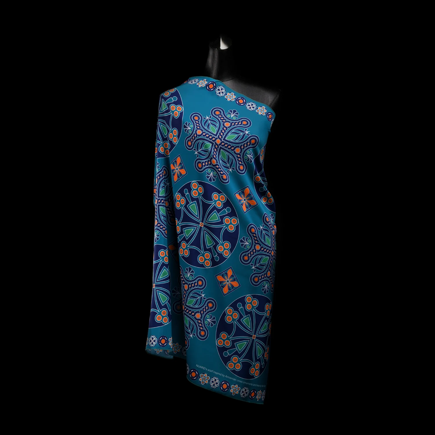 NUARD’s silk scarf features Armenian medieval cross motifs, brought to life through a graceful harmony of turquoise and orange.