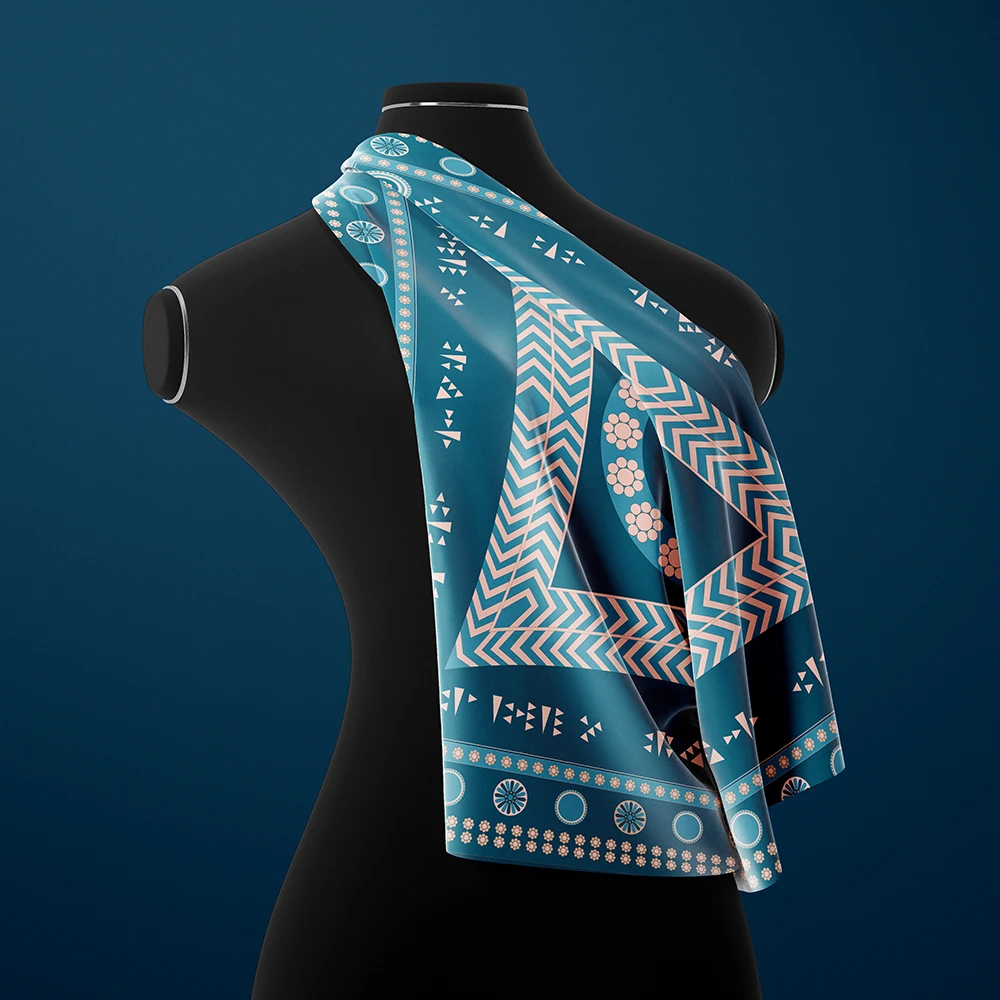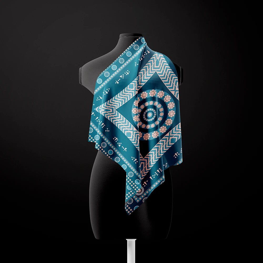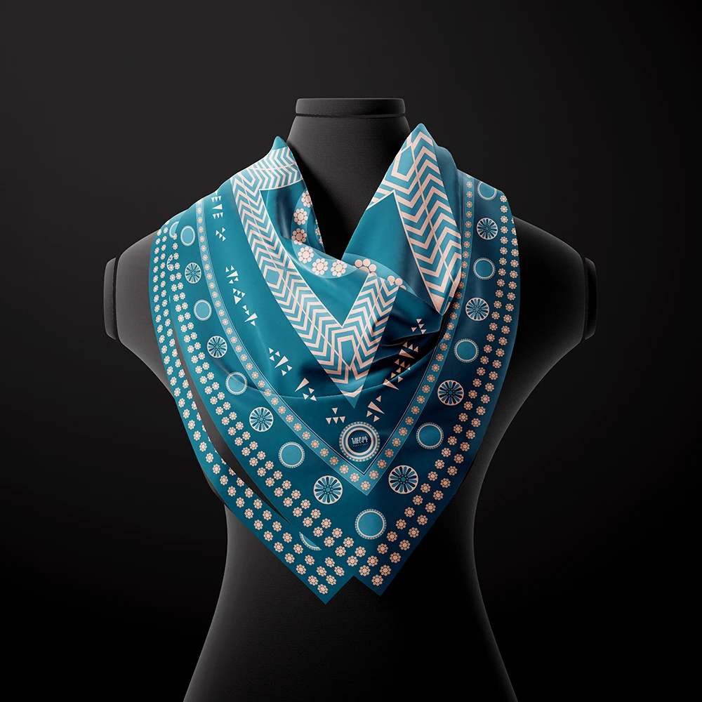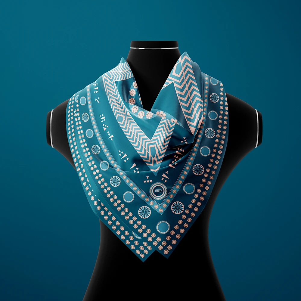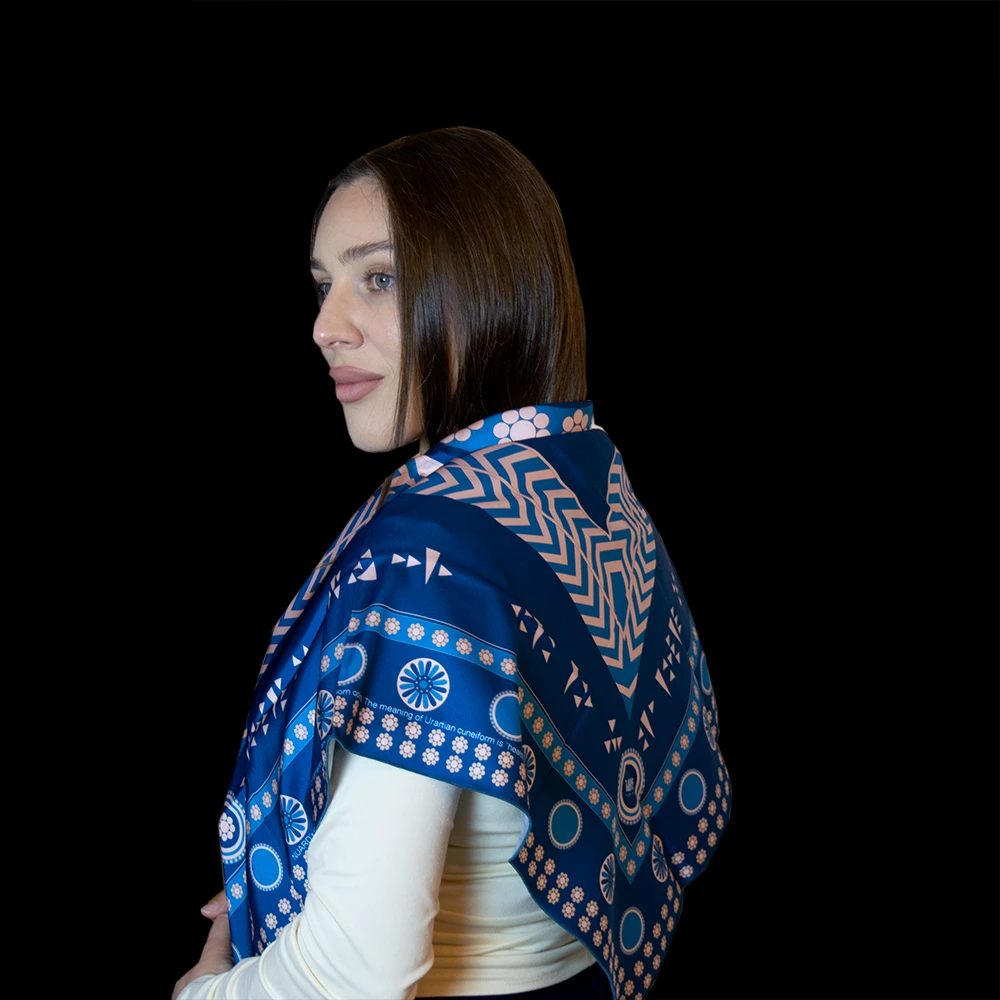 The silk scarf is adorned with elegant Urartian patterns featuring a vibrant sun symbol that imbues the piece with unique strength and expressiveness.