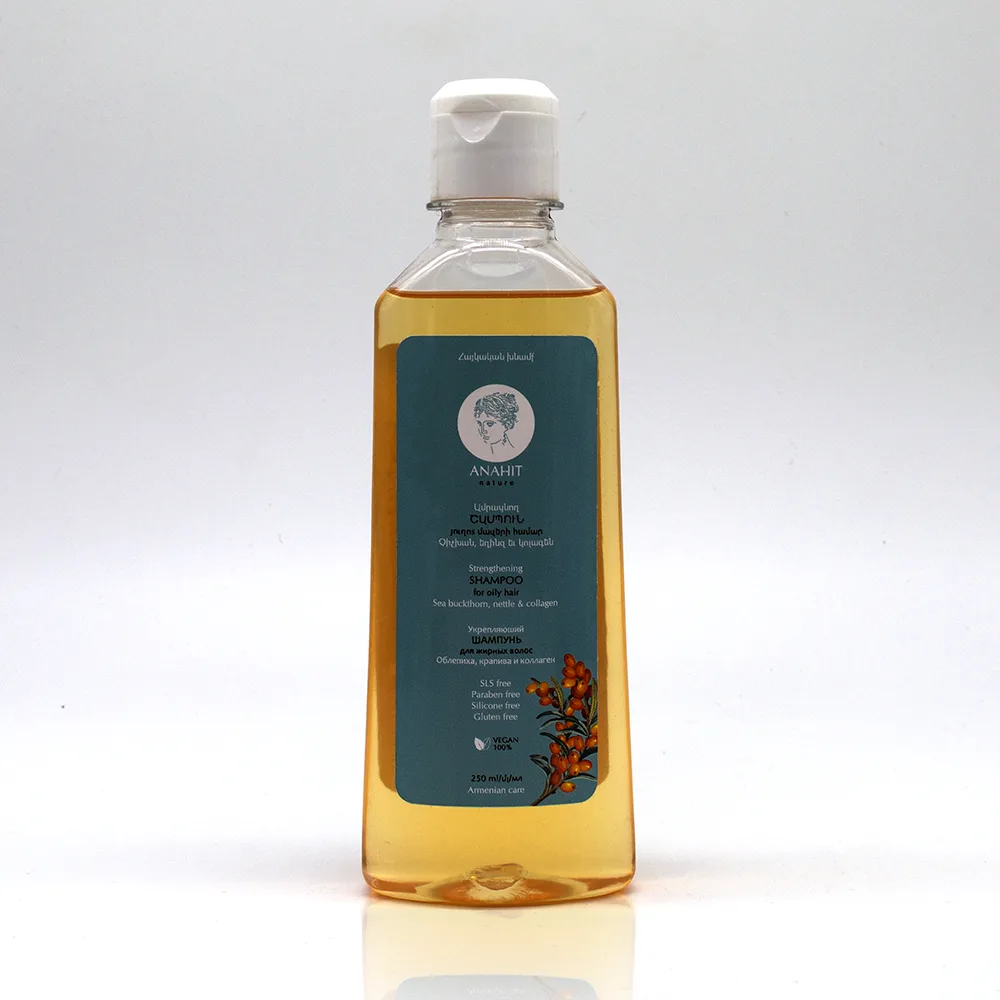 ANAHIT shampoo is made from extracts of nettle, sea buckthorn, chamomile, collagen, and other ingredients designed for oily hair. Regular use of the shampoo significantly reduces oiliness, strengthens hair, and gives it noticeable volume and shine.
