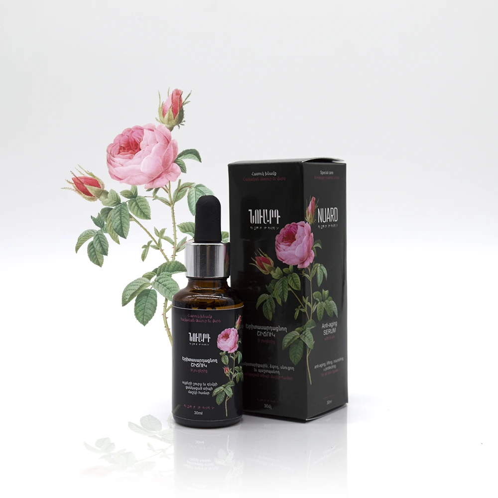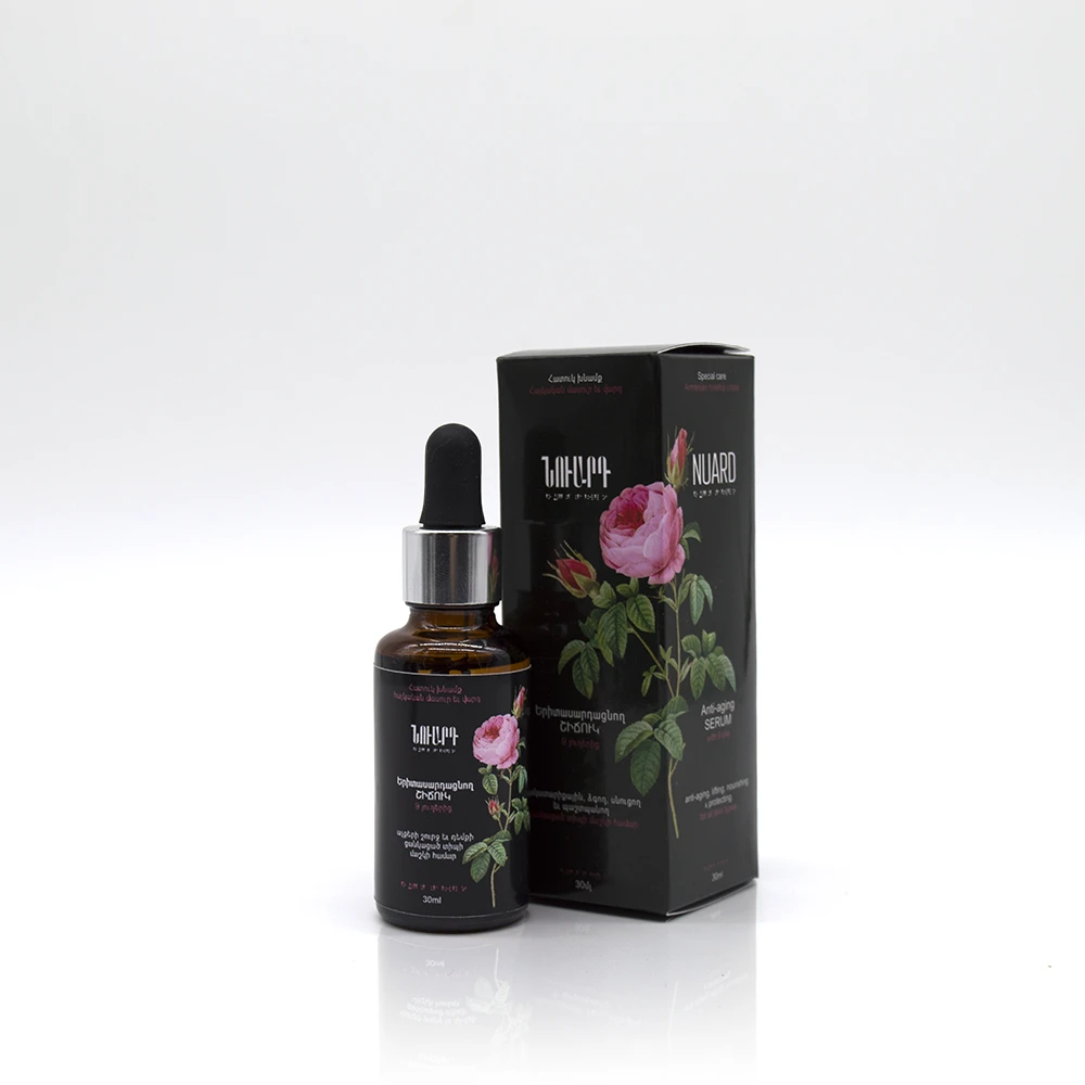 This rejuvenating NUARD serum is made from a unique blend of 9 base and essential oils and is designed for women over 35. Its formula includes well-known and beneficial Armenian rosehip, grape seed, and pomegranate seed oils, as well as hemp and argan oils. The serum also contains essential oils of lemon, Damascus rose, Armenian pelargonium, and frankincense, along with vitamin E — all known for their rejuvenating, firming, and restorative properties. Thanks to its natural composition, the serum can be confidently used on all skin types, both around the eyes and on the entire face. It absorbs quickly, strengthens skin tissues, smooths fine lines, does not clog pores, and offers unique healing and revitalizing benefits.