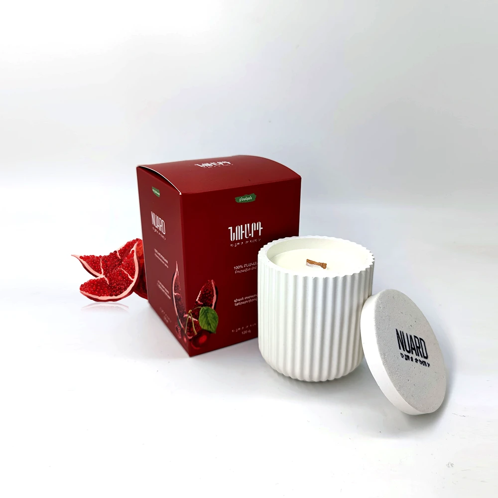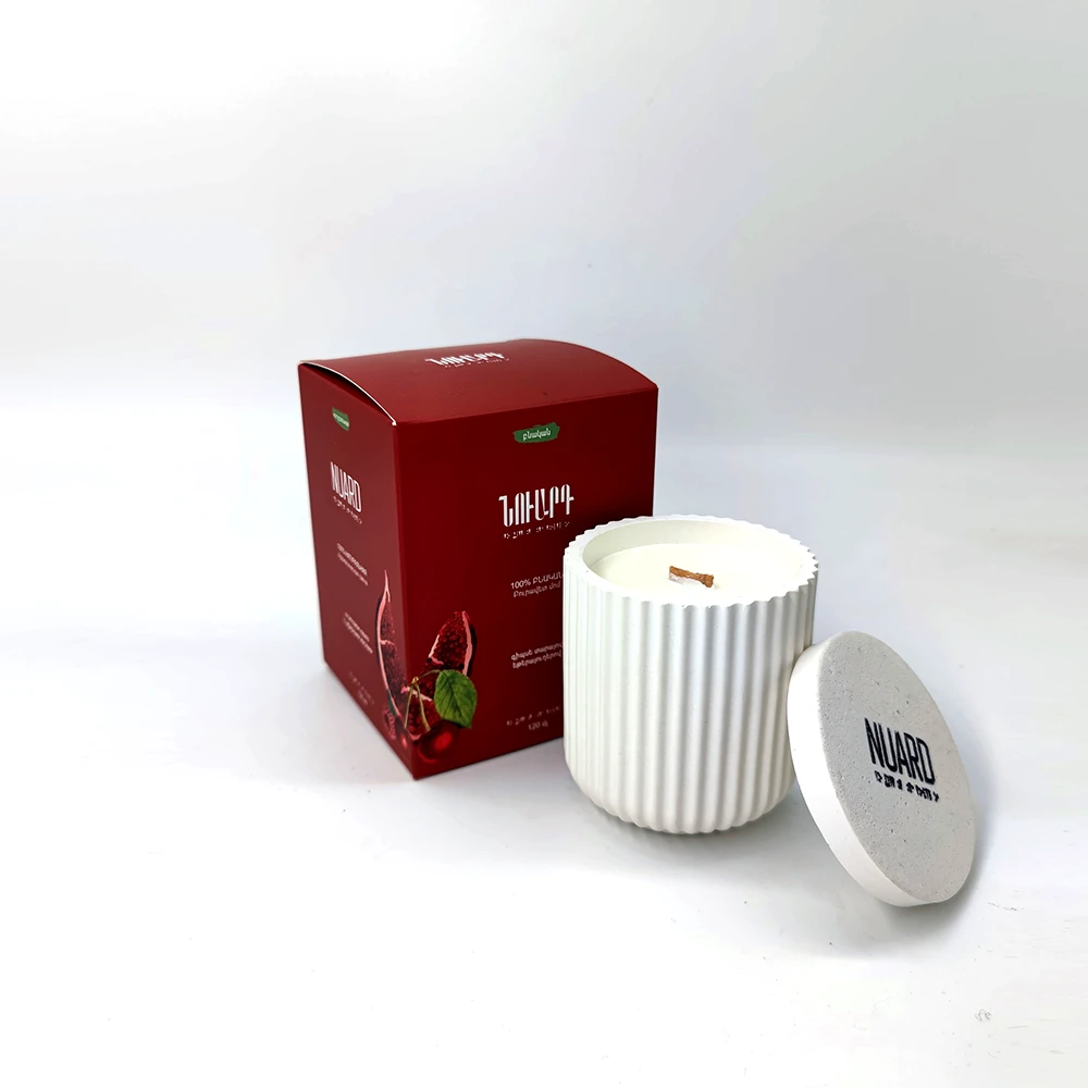 Գիպսե տարայով եւ փայտե ֆիթիլով ՆՈՒԱՐԴ-ի ձեռագործ մոմը պատրաստված է բնական բաղադրիչներից` 100% պրեմիում դասի սոյայի ոսկից, օծանելիքից եւ բարձրորակ եթերայուղերից: Բույրերի վառ համադրությամբ աչքի ընկնող ՆՈՒԱՐԴ-ի մոմի անուշ բույրը տարածվելով ձեր տանը՝ ձեր շուրջը կստեղծի դրական էներգիա, կառաջացնի հարմարավետության զգացում: Ծաղիկների, հատապտուղների և մրգերի բույրով այս մոմն ընդամենը 1-2 ժամում սենյակը կլցնի դյութիչ բույրով: Մոմի բույրը տարածվում է նույնիսկ բացված կափարիչի դեպքում՝ անգամ առանց մոմը վառելու: