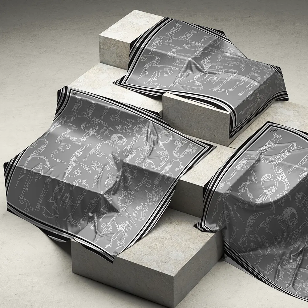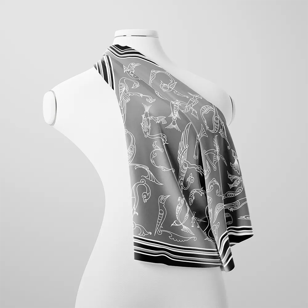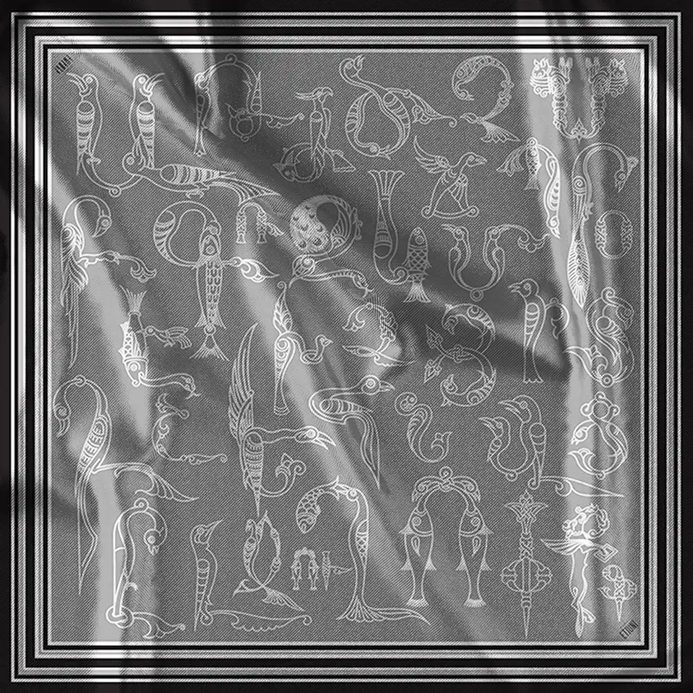 ԳլխավորԽանութԷթիունի Մետաքսե շարֆ «Թռչնատառեր. մոնոքրոմ» արծաթագույն երանգներով, կոդ-514