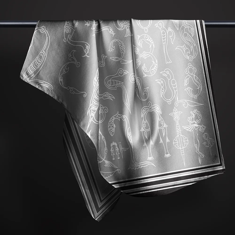 ԷԹԻՈՒՆԻ ապրանքանիշի այս ոճային շարֆը ներշնչված է հայկական թռչնատառերից՝ ներկայացված արծաթագույն երանգներով։