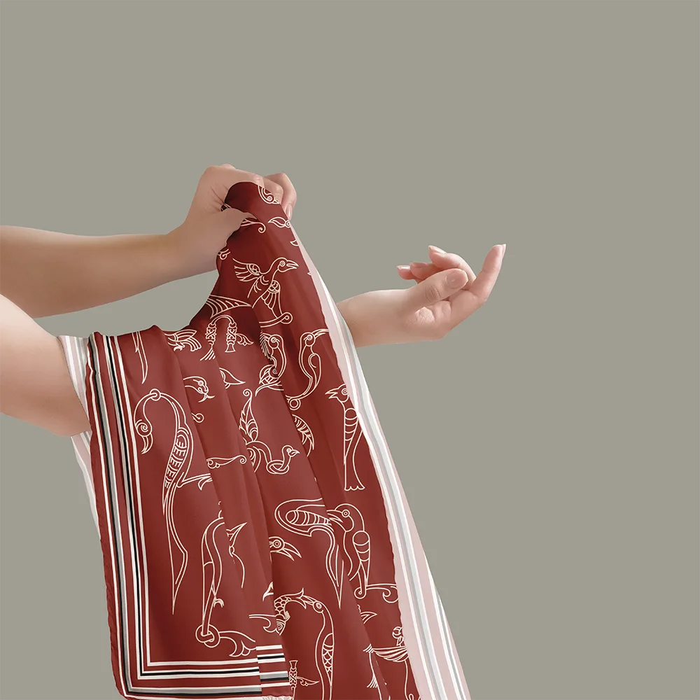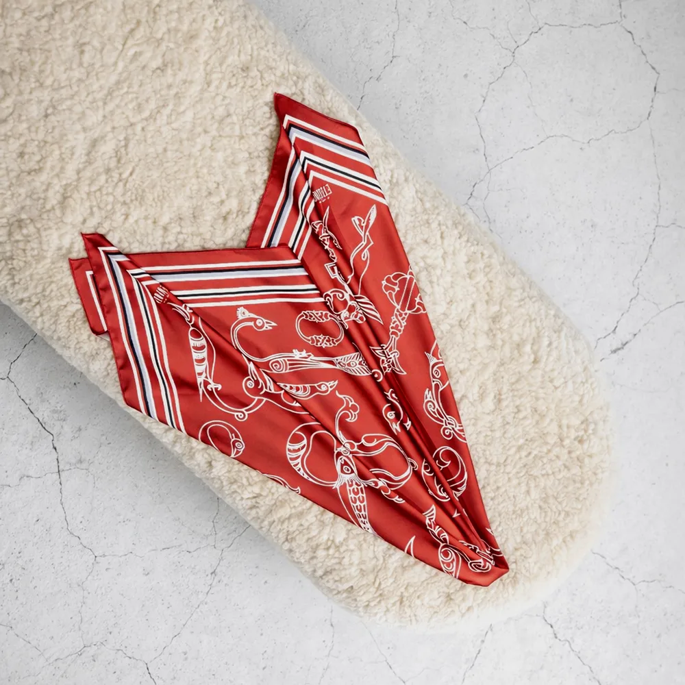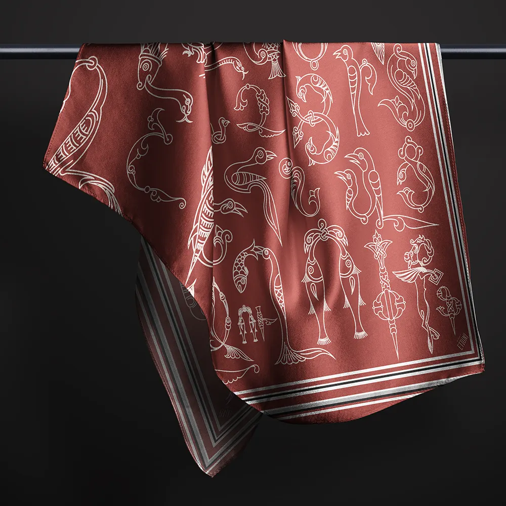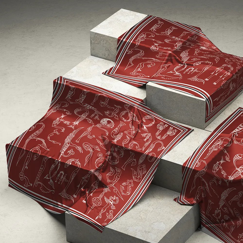 ԷԹԻՈՒՆԻ ապրանքանիշի այս ոճային շարֆը ներշնչված է հայկական թռչնատառերից՝ ներկայացված գինեգույն կարմիր երանգներով։