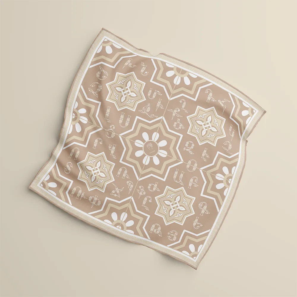 ԱՆԱՀԻՏ-ի այս մետաքսե շարֆը՝ թռչնատառերի մուգ և բաց մարմնագույն երանգներով, միավորում է հայկական ավանդական դիզայնը պորտուգալական ազուլեժուի արվեստի հետ՝ ստեղծելով յուրահատուկ և ժամանակակից տեսք։