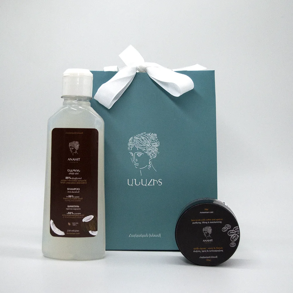 ԳլխավորԽանութԱնահիտ Նվեր հավաքածու 24` թեփի դեմ շամպուն և դեմքի սկրաբ սուրճ և ծիրան
