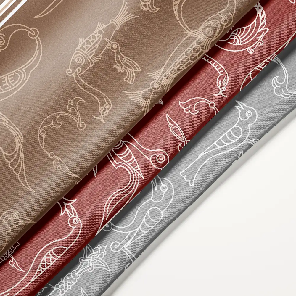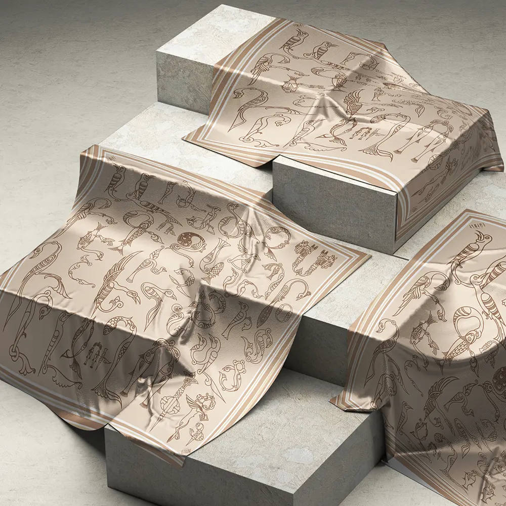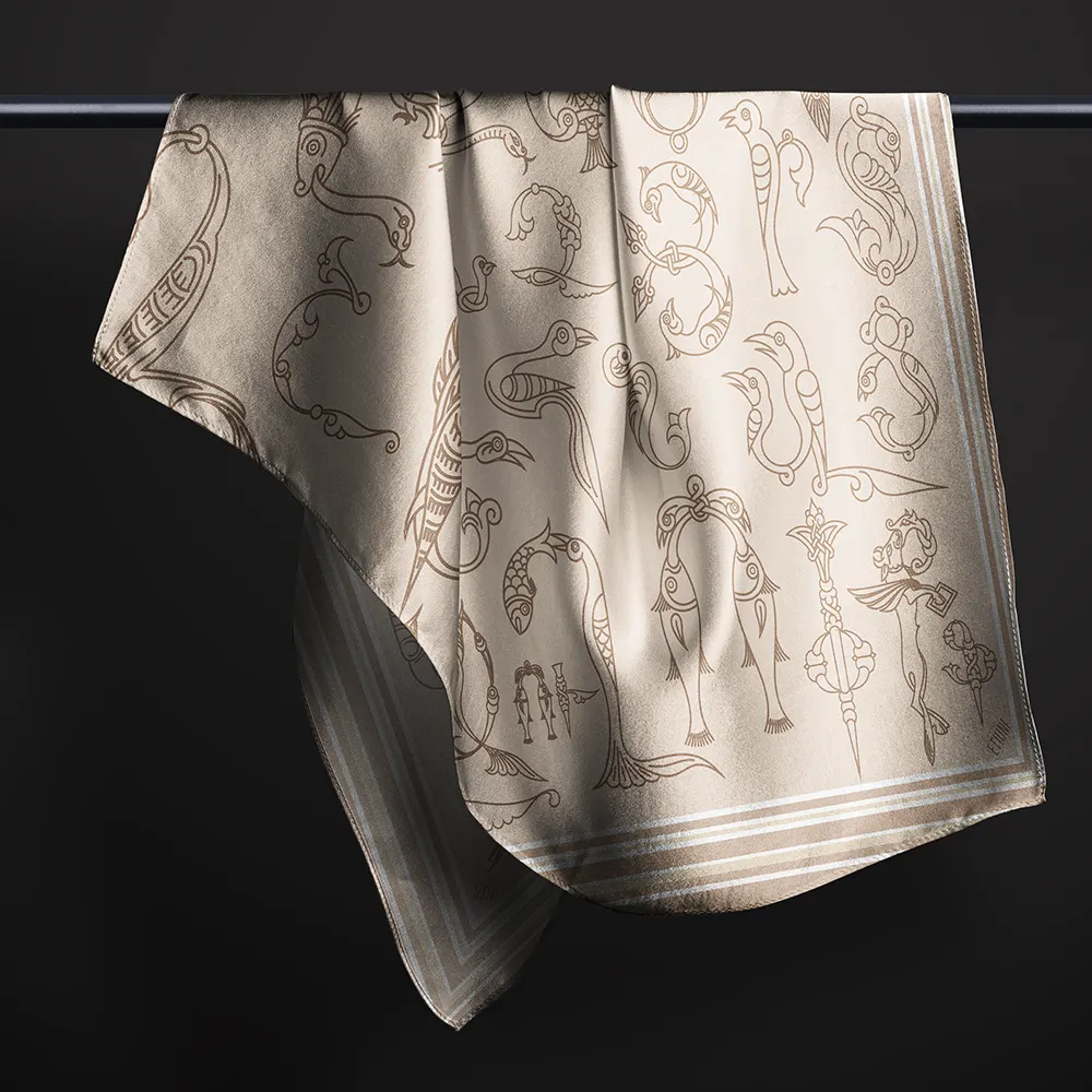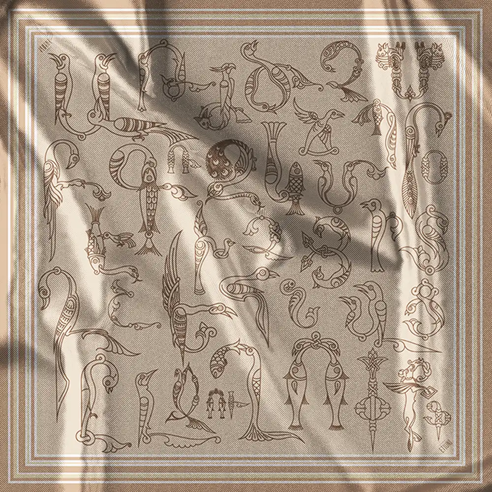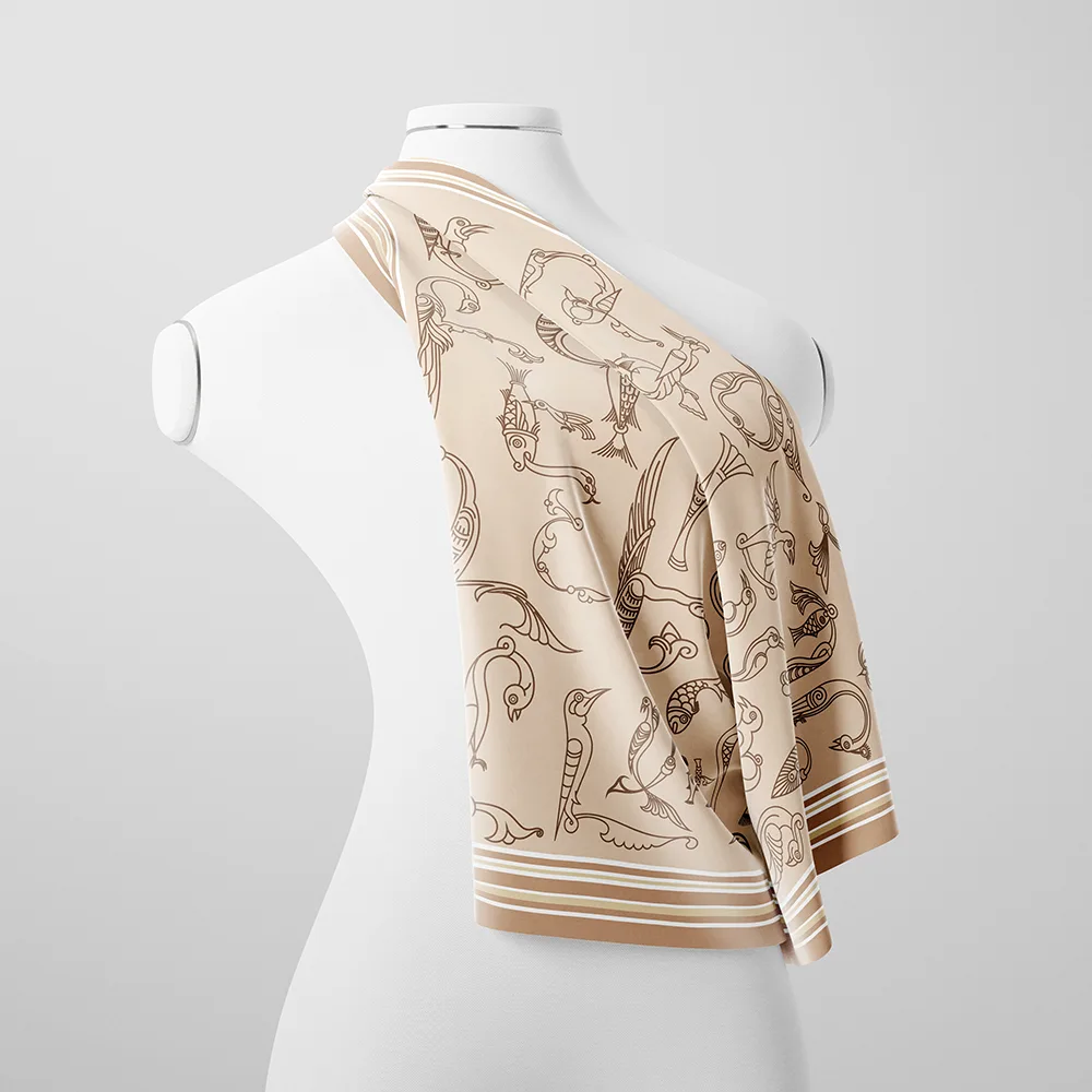 ԷԹԻՈՒՆԻ ապրանքանիշի այս ոճային շարֆը ներշնչված է հայկական թռչնատառերից՝ ներկայացված խաղաղ մարմնագույն ֆոնի վրա։