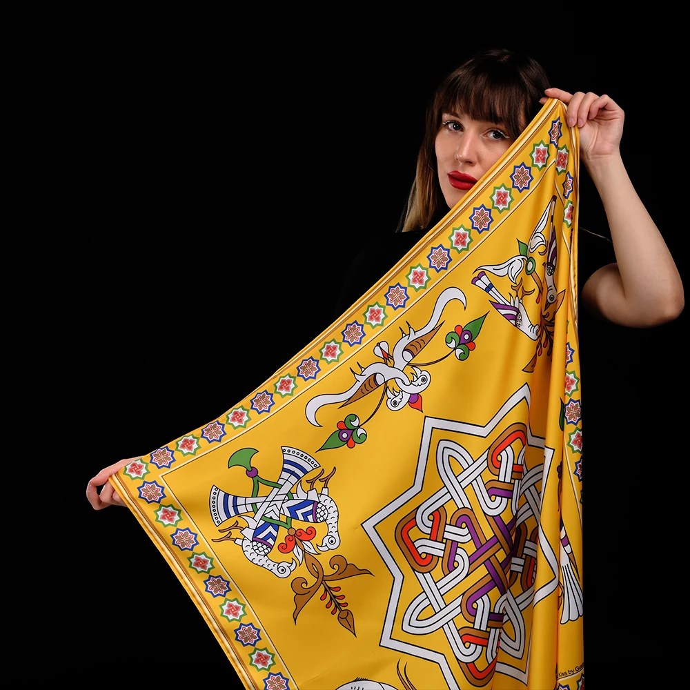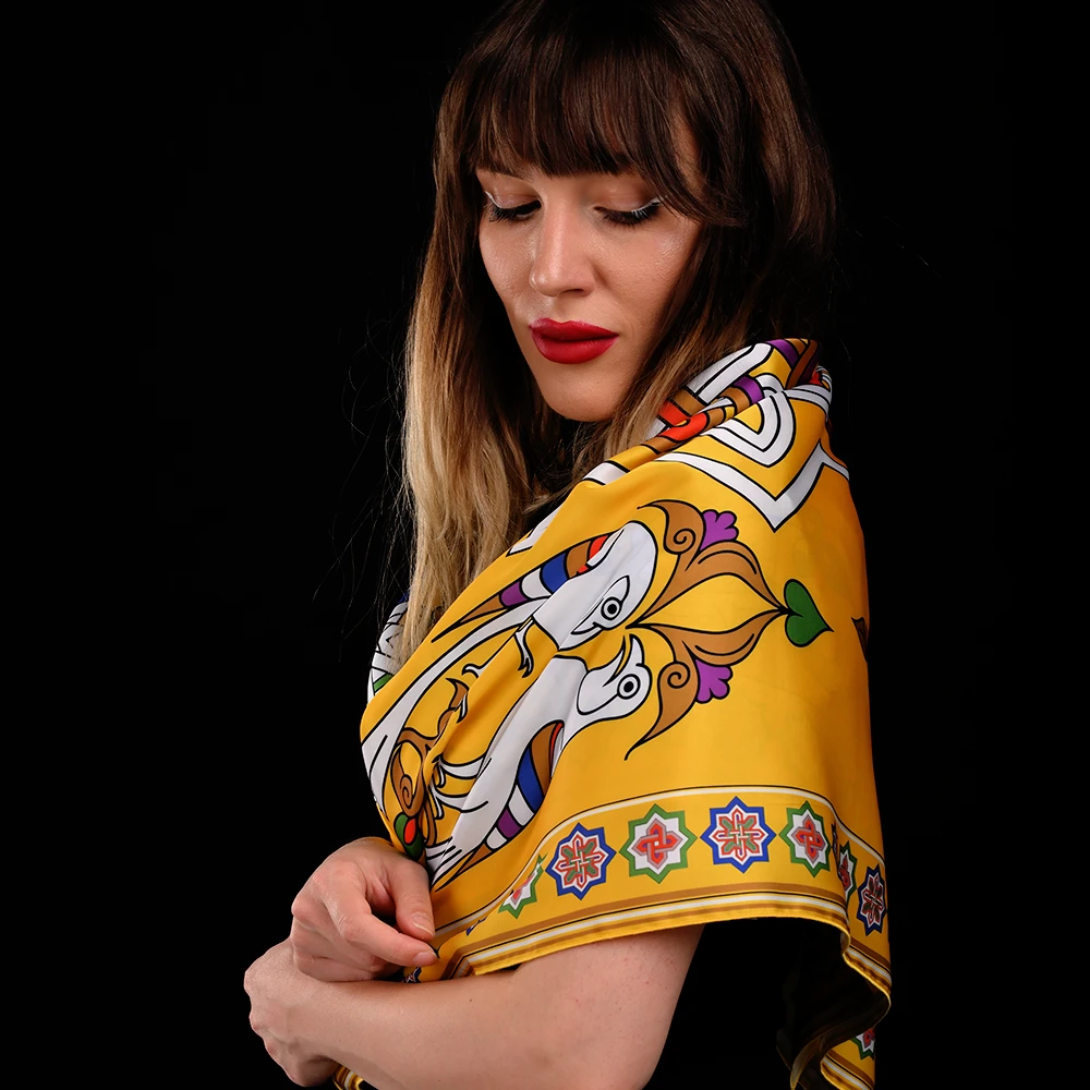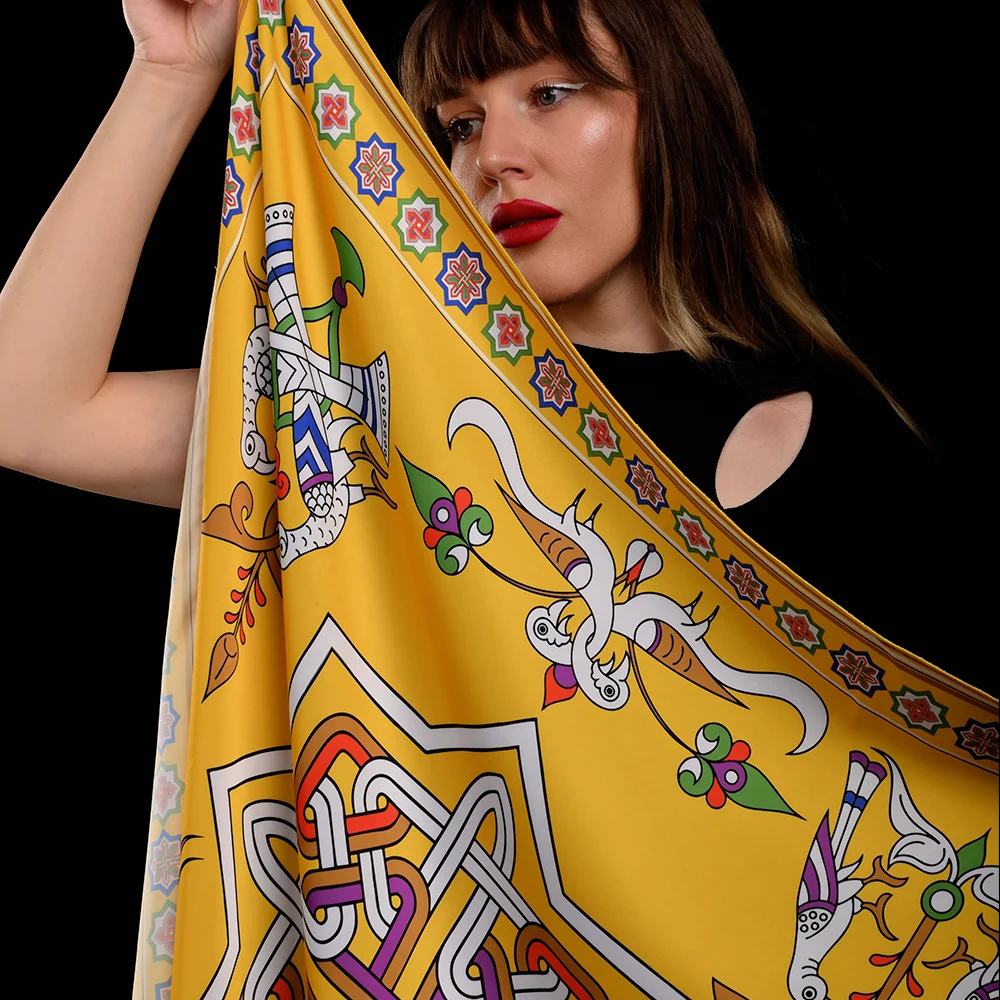 При создании этого шарфа НУАРД мы вдохновлялись армянскими средневековыми орнаментами с изображением птиц и объединили их с цветами картины Густава Климта «Поцелуй», особенно выделяя оттенки жёлтого. В шелковом шарфе вы увидите любовный поцелуй птиц, окрашенный в красивые золотистые и бронзовые тона. Этот эксклюзивный шарф поражает своими яркими красками, которые сразу привлекают внимание.