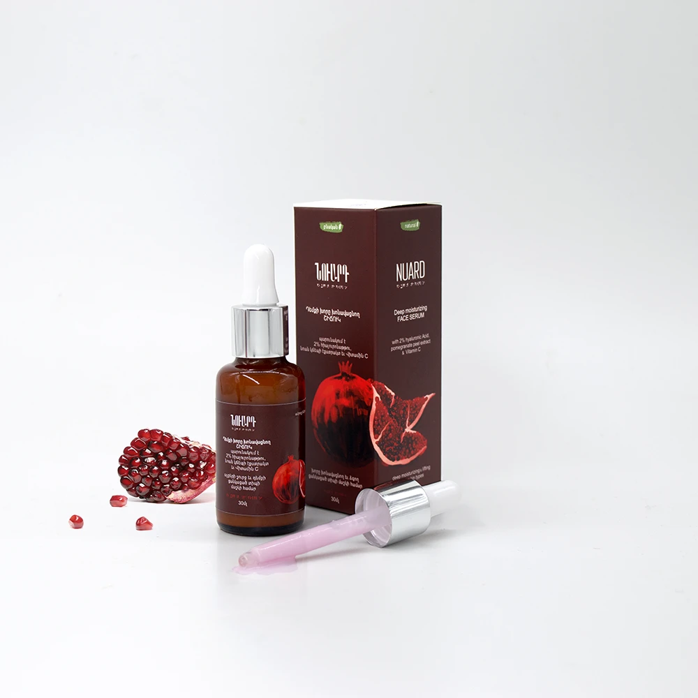 Глубоко увлажняющая сыворотка НУАРД создана на основе экстрактов кожуры граната, ромашки, камнеломки, 2% гиалуроновой кислоты, витамина C и других уникальных компонентов. Экстракты кожуры граната, камнеломки и витамин C стимулируют выработку коллагена и интенсивно увлажняют кожу, а экстракт ромашки обладает противовоспалительными и успокаивающими свойствами. Содержащаяся в сыворотке 2% гиалуроновая кислота считается одним из лучших увлажняющих компонентов в мире. Эта сыворотка также идеально подходит в качестве основы под макияж, обеспечивая глубокое увлажнение перед нанесением косметики.